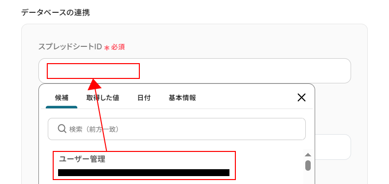 左側の項目にはGoogle スプレッドシートに設定している項目名が表示されます。