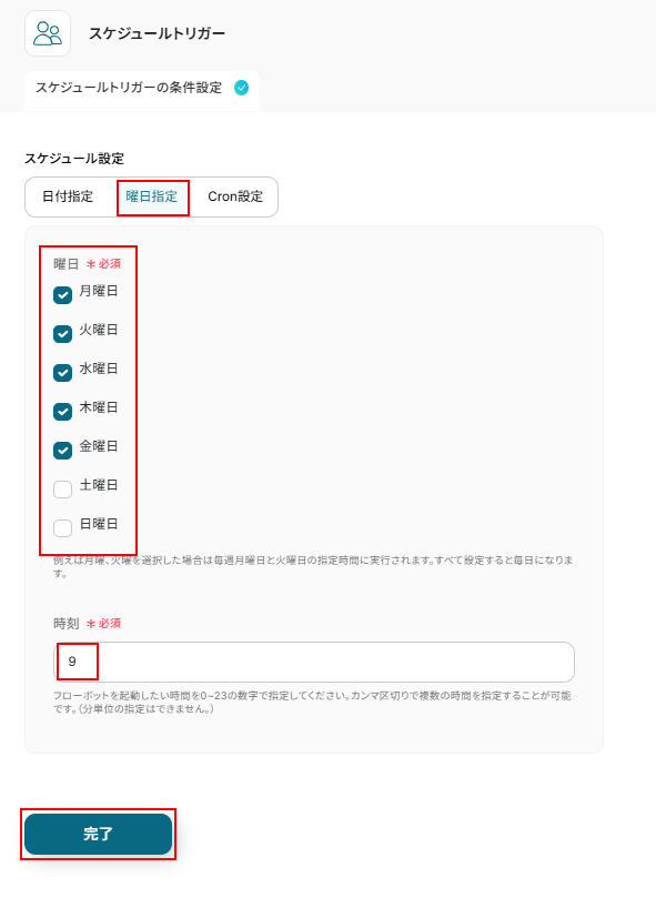 今回はデフォルトで設定されている曜日指定を使用し、月曜日から金曜日の朝9時に起動するように設定しました。