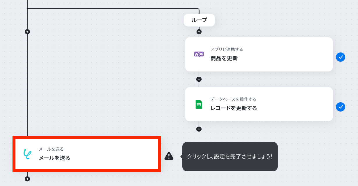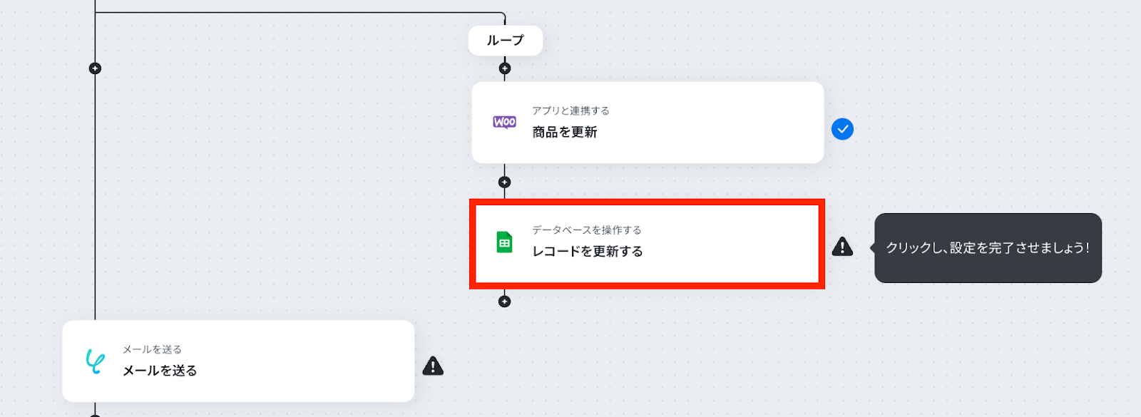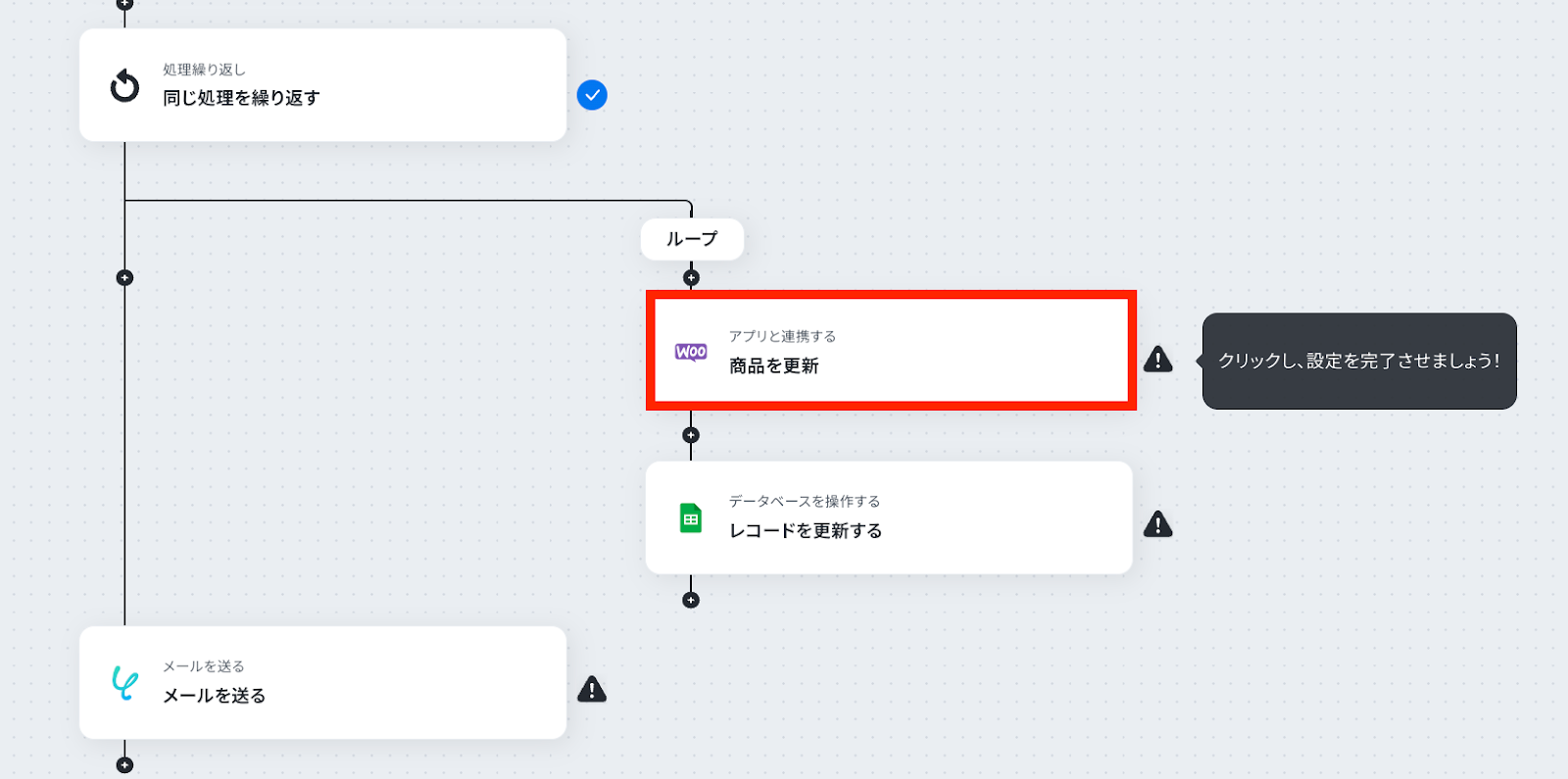 はじめに、Google スプレッドシートとWooCommerceをYoomと連携します 次に、トリガーでスケジュールトリガーを選択し、フローボットを起動するスケジュールを設定します 次に、オペレーションでGoogle スプレッドシートを選択し、「複数のレコードを取得する」アクションで更新対象の商品リストを取得します 取得した商品データそれぞれに対して処理を行うため、繰り返し処理を設定します 繰り返し処理の中で、WooCommerceの「商品を更新」アクションを設定し、スプレッドシートの情報をもとに商品情報を更新します 次に、Google スプレッドシートの「レコードを更新する」アクションを設定し、更新が完了したレコードにステータスなどを追記します 最後に、メール機能の「メールを送る」アクションで、担当者へ処理完了の通知を行います ■このワークフローのカスタムポイント