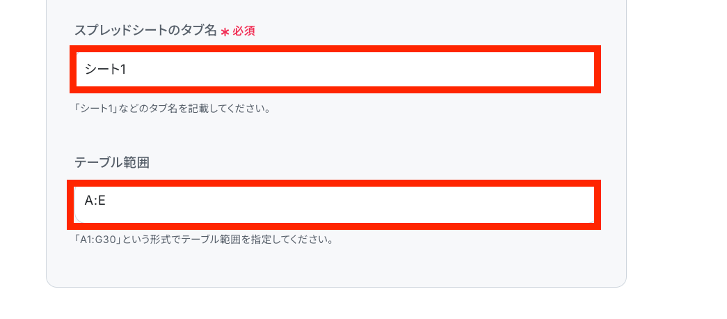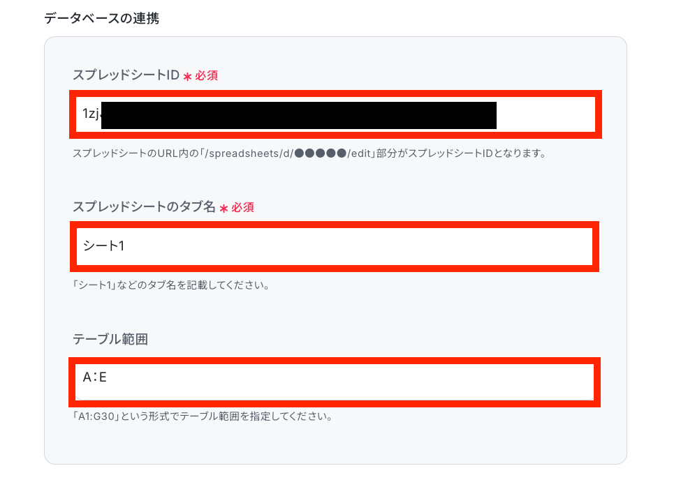 同じ要領で「スプレッドシートID」を候補から選びます。 「テーブル範囲」はGoogle スプレッドシートに合わせて設定しましょう。