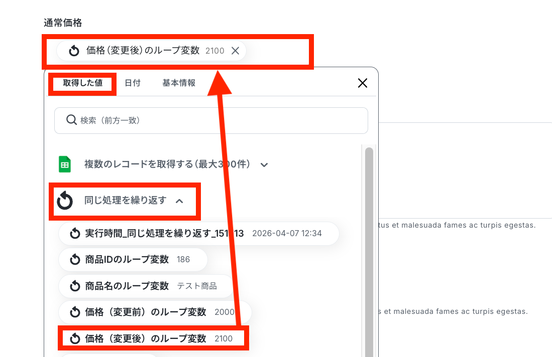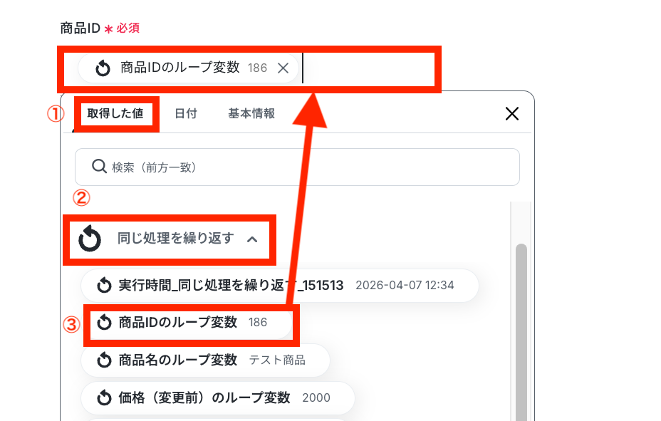 【取得した値を埋め込む方法】 ①入力欄をクリックして「取得した値」を表示 ②「同じ処理を繰り返す」をクリック ③「商品IDのループ変数」を選択