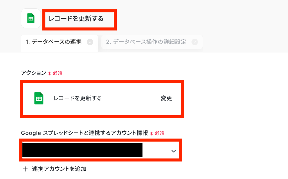 ステップ7:Google スプレッドシートの更新設定 「レコードを更新する」をクリックします。