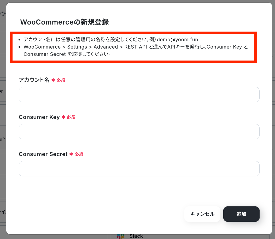 WooCommerceとYoomの連携方法 WooCommerceを検索すると新規登録画面が表示されます。 赤枠部分を参考にしながら「アカウント名」と「Consumer Key」と「Consumer Secret」を入力して「追加」ボタンをクリックしたら連携完了です!