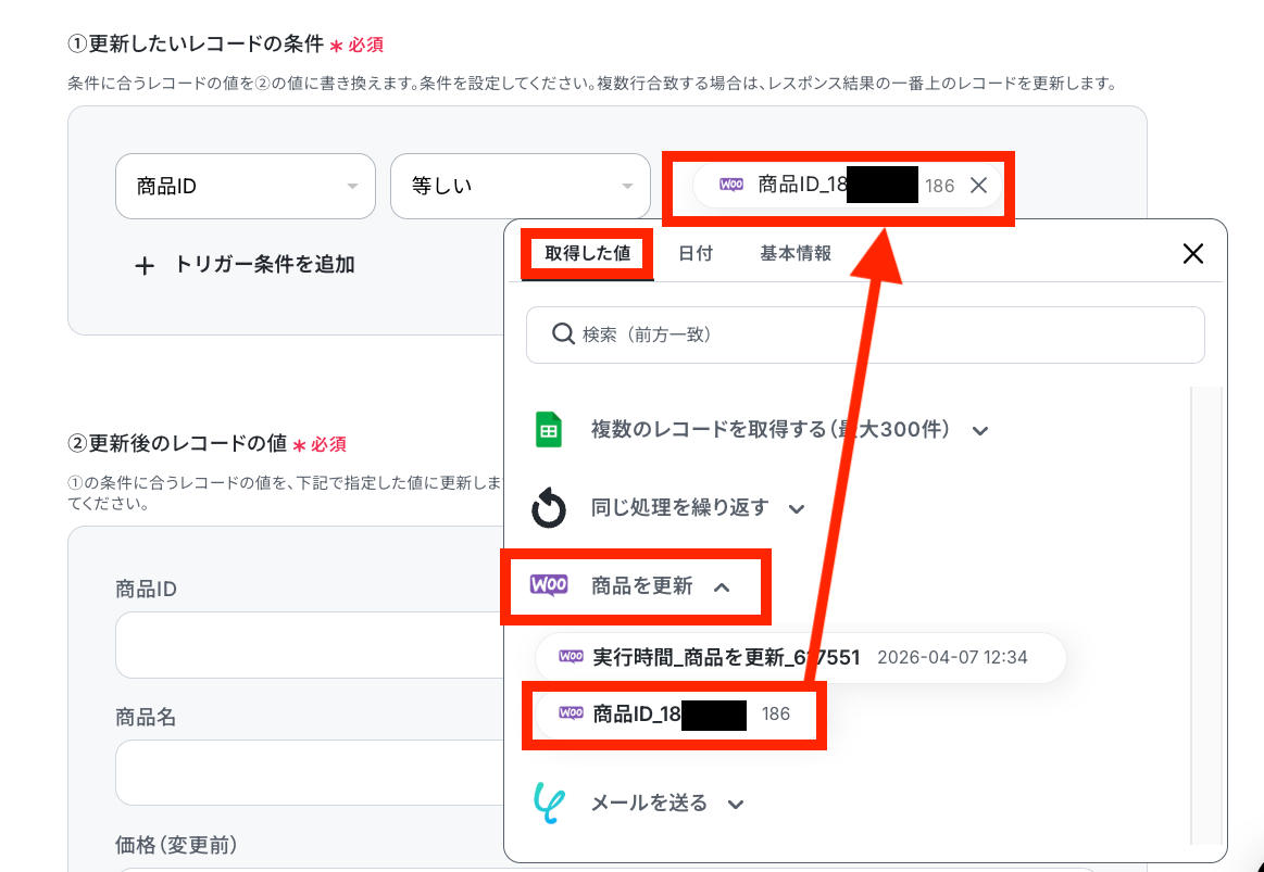 「①更新したいレコードの条件」を下の画像の通り、取得した値を埋め込んで設定してください。