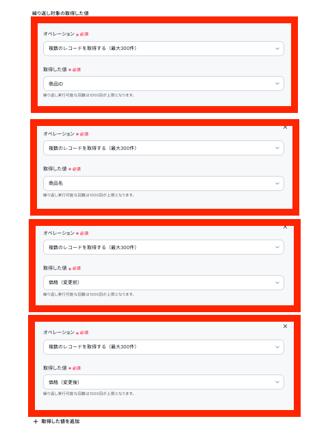 「商品ID」は取得した値を埋め込みます。 手入力で商品IDを設定してしまうと、フローボットが起動する度に同じIDばかりが反映されてしまうので、注意してください!