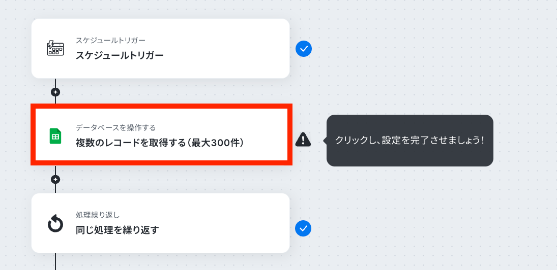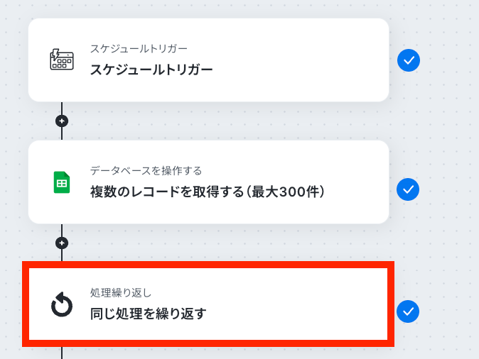 ステップ5:同じ処理を繰り返す設定 「同じ処理を売り返す」をクリックします。 ※「同じ処理を繰り返す」オペレーションは「チームプラン・サクセスプラン」でのみ利用できる機能です。フリープラン・ミニプランの場合は設定しているフローボットのオペレーションやデータコネクトはエラーとなるので、ご注意ください。