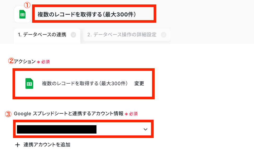 ②アクション:デフォルトで「複数のレコードを取得する(最大300件)」が選択されているのでそのままで問題ありません! ③Google スプレッドシートと連携するアカウント情報:ステップ1で連携したアカウントが表示されていることを確認しましょう。