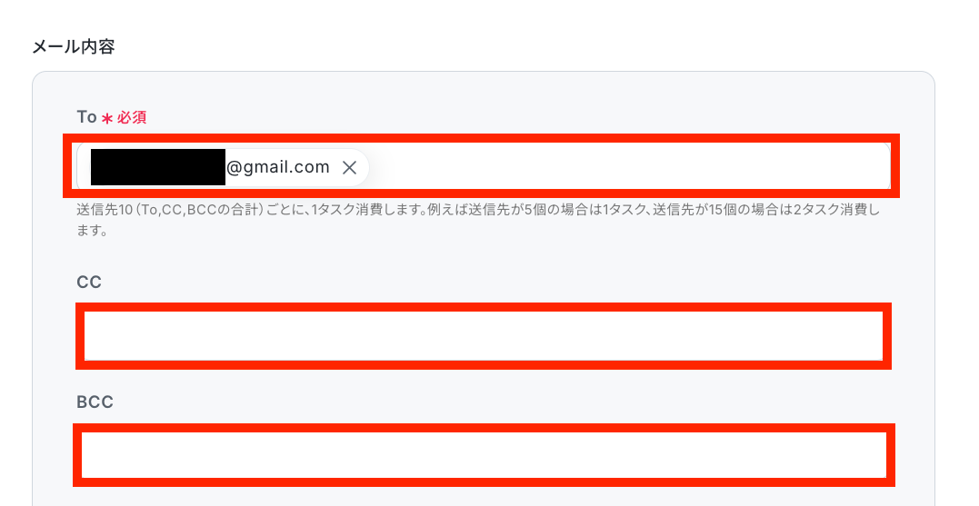 「To」に送信先のアドレスを入力します。 (CCとBCCは必要に応じて設定してください。)