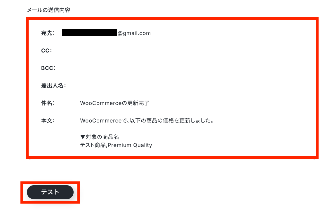 「次へ」をクリックすると「メールの送信内容」が表示されるので問題なければ「テスト」を押してください。