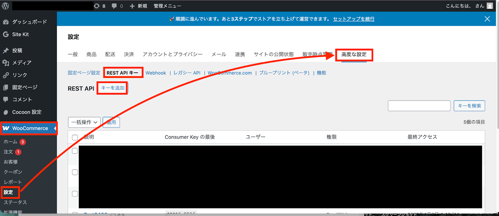 「Consumer Key」と「Consumer Secret」はWooCommerceから取得できます! WooCommerceにログインして、WooCommerceの「設定」をクリックしてください。 「高度な設定」→「REST APIキー」→「キーを追加」の順番に進んでいくと取得できます。