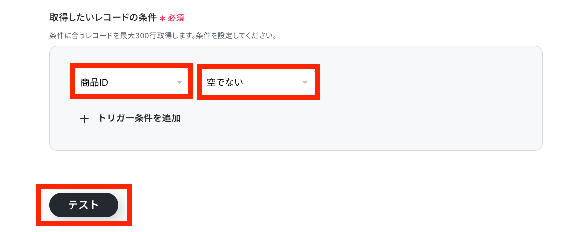 「取得したいレコードの条件」を下の画像のように設定します。 設定が完了したら「テスト」をクリックしてください。