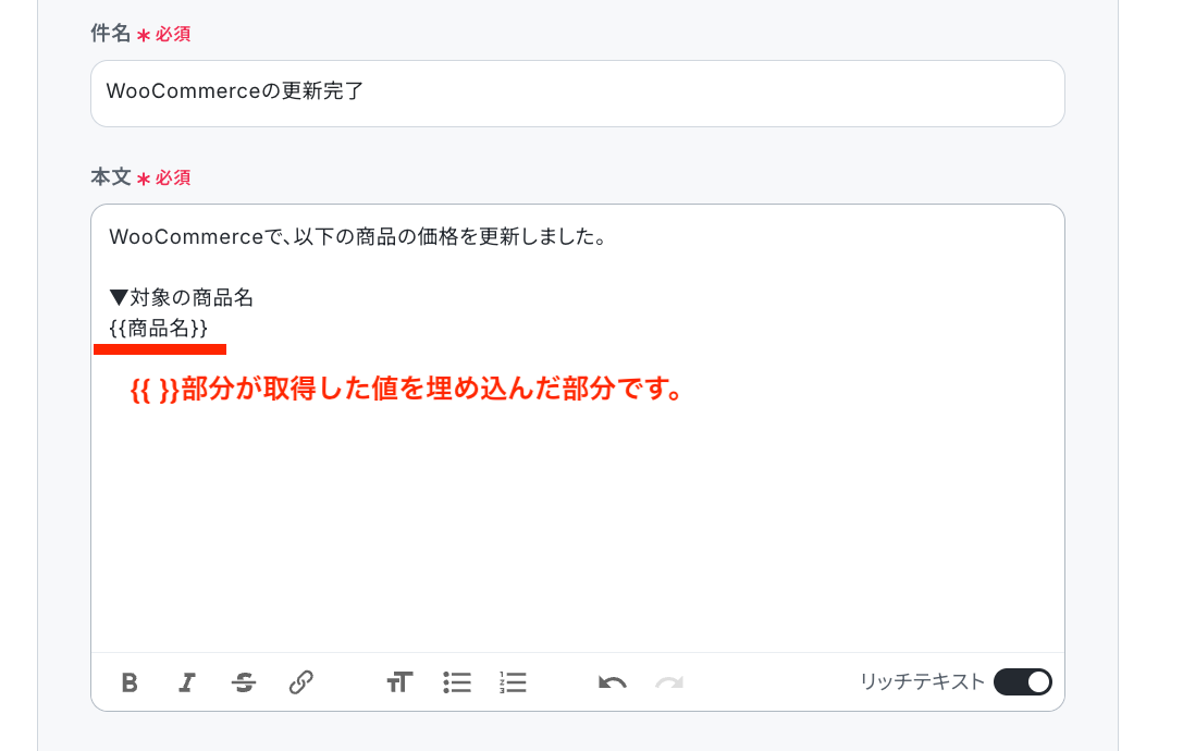 WooCommerceで商品を作成するオペレーションでは、トリガーで取得したBASEの商品情報を活用できます 具体的には、WooCommerceの商品名や商品説明の項目に、前段のBASEから取得した値を動的な変数として埋め込むことで、情報をそのまま反映させることが可能です ■注意事項