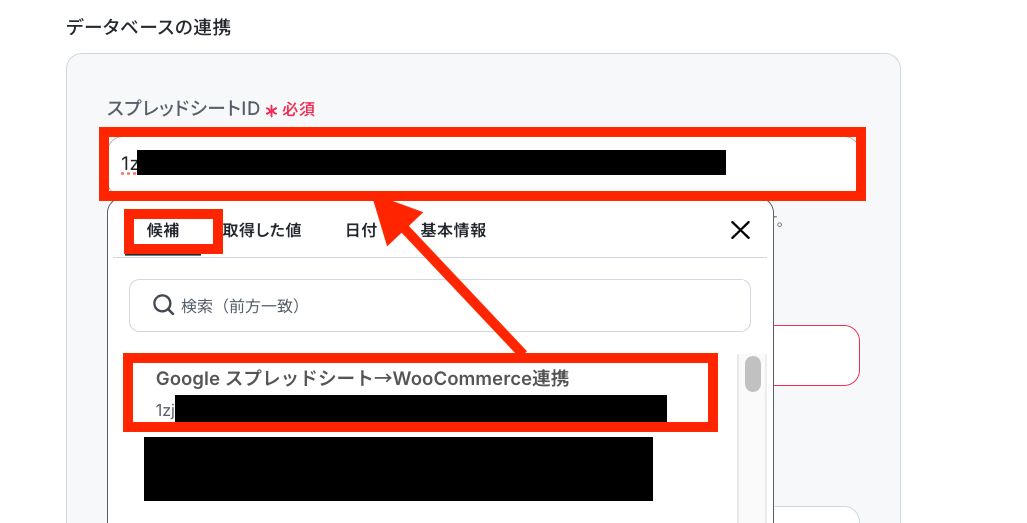 「スプレッドシートID」の入力欄をクリックすると、候補一覧が表示されます。 候補の中から連携したいシート名を選んでください。