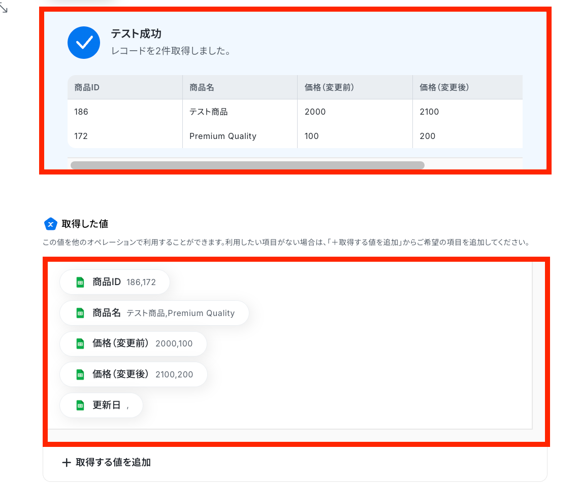 テストに成功すると、Google スプレッドシートのデータが「取得した値(※)」の欄に反映されるので、確認できたら「完了」をクリックしてください。 ※取得した値 とは? トリガーやオペレーション設定時に「テスト」を実行して取得した値のことです。 後続のオペレーション設定時の値として利用でき、フローボットを起動する度に変動した値となります。