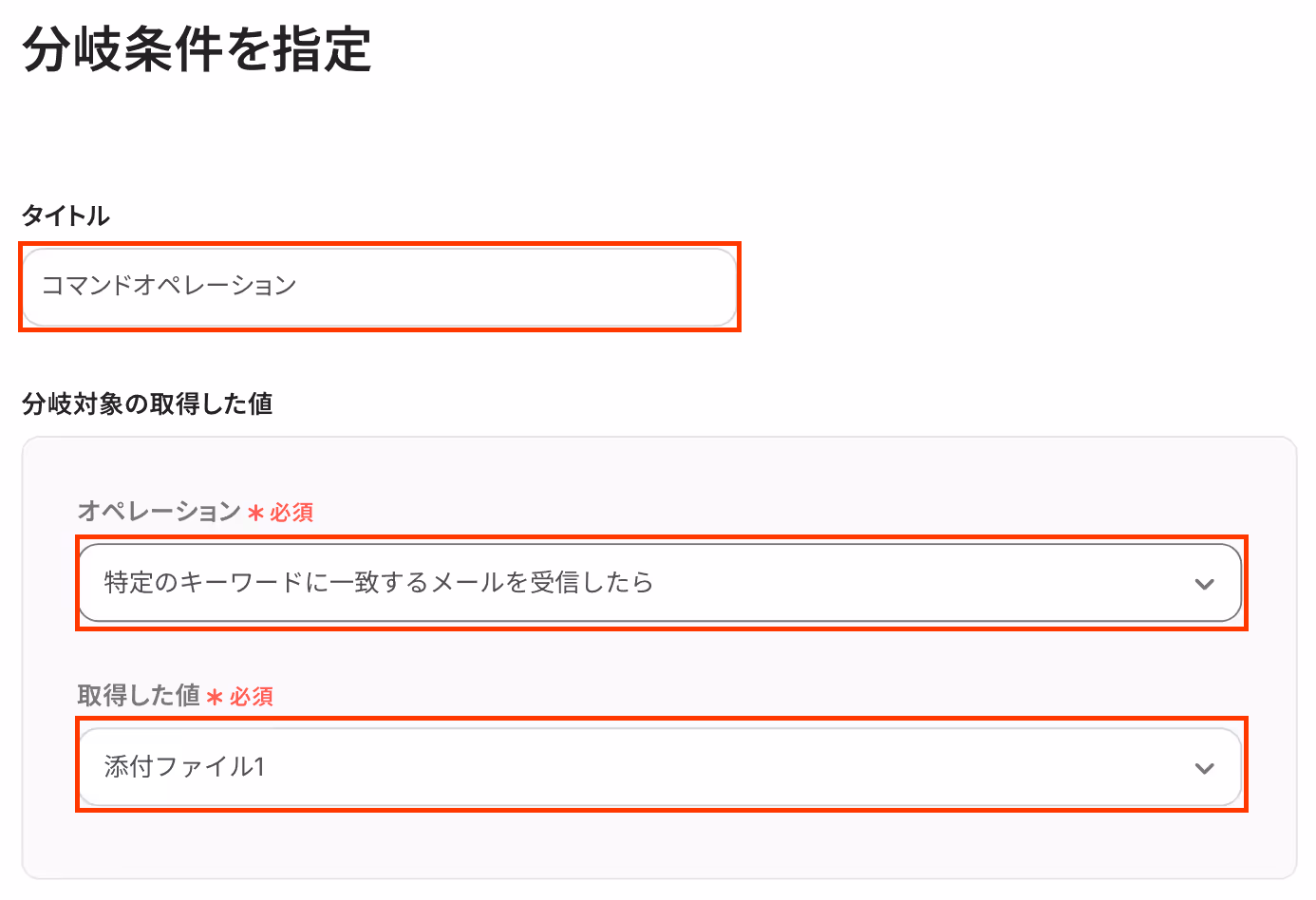 「分岐対象の取得した値」の「オペレーション」は、「特定のキーワードに一致するメールを受信したら」を選択してください。