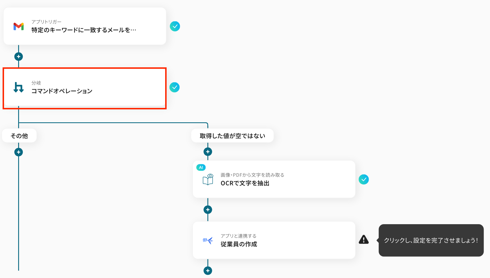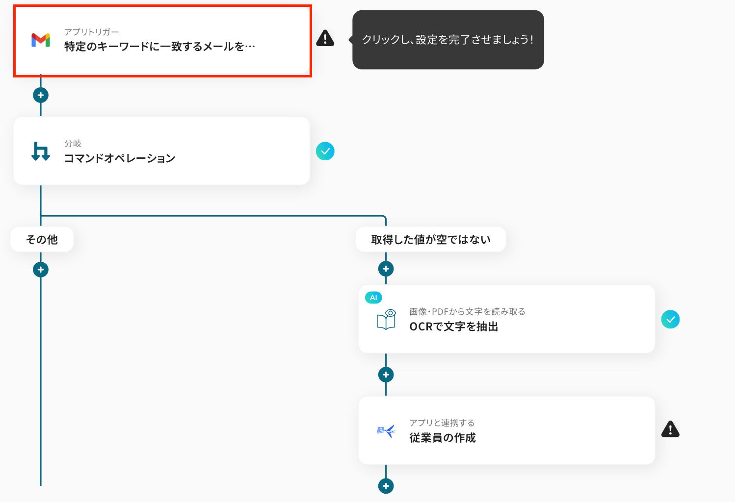 ここから「Gmailで入社案内のメールを受信したら、添付ファイルをOCRしfreee人事労務に従業員を登録する」フローを設定していきます。