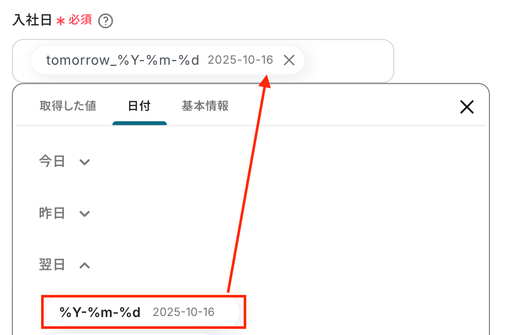「生年月日」:こちらも同様に入力欄をクリックして表示される取得した値から選択します。
