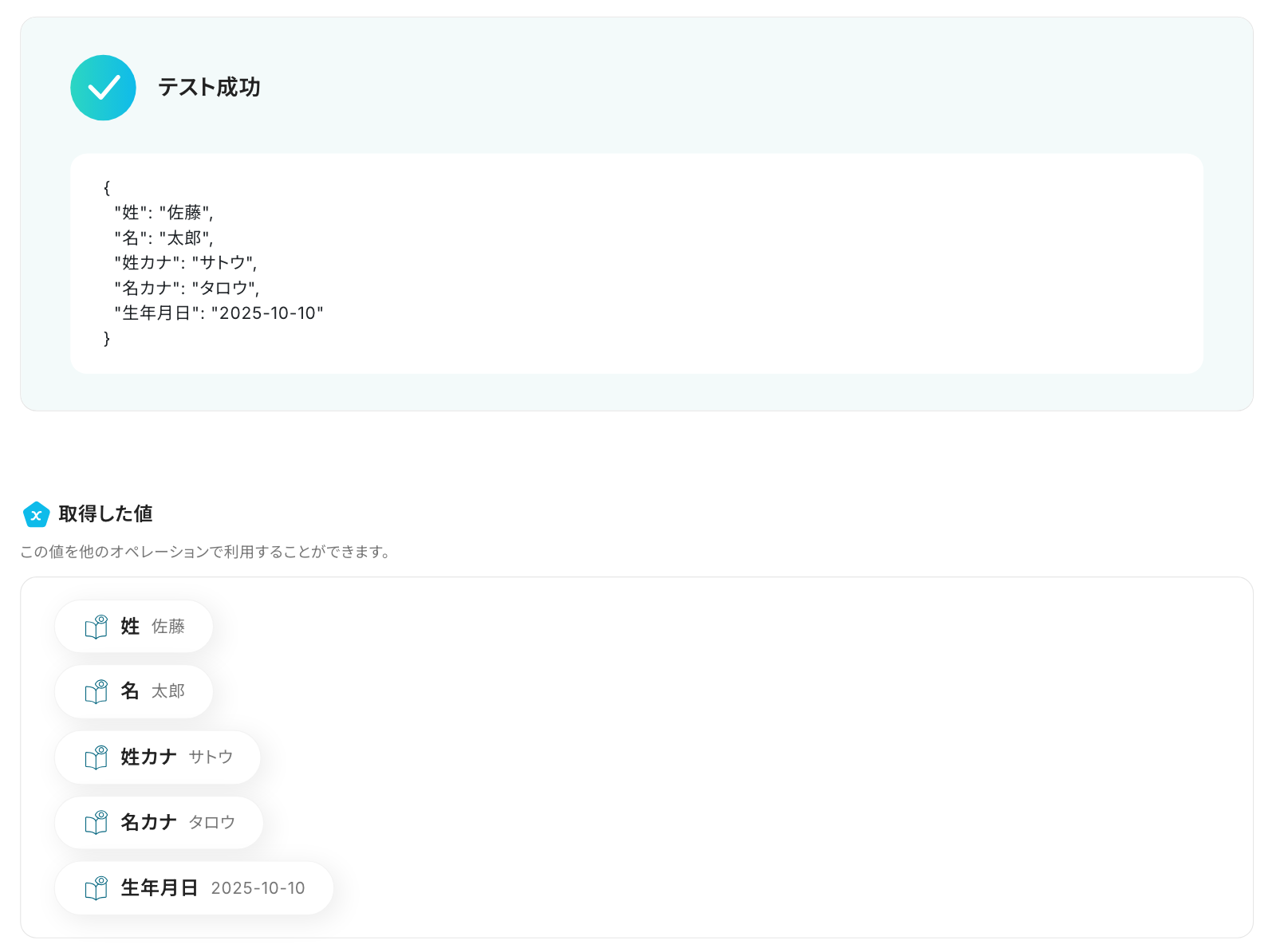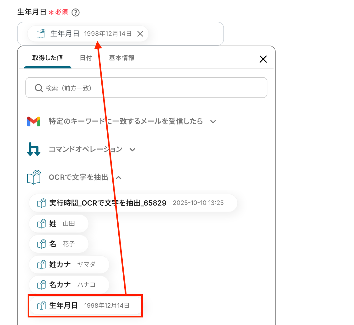 すると、OCRで読み取った情報が取得した値に表示されました!
