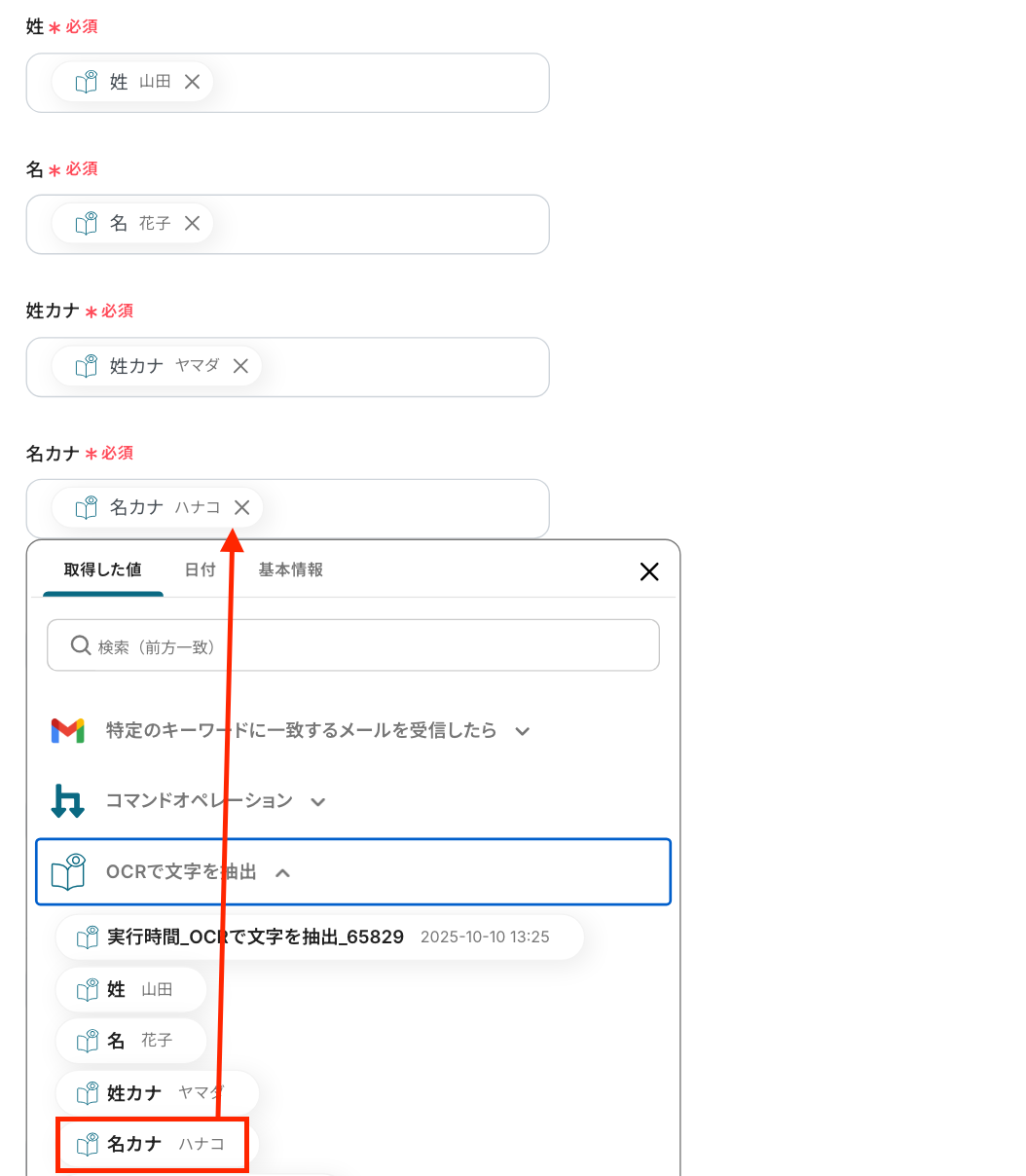「姓」・「名」・「姓カナ」・「名カナ」:OCRの設定で取得した値から該当するものをクリックします。