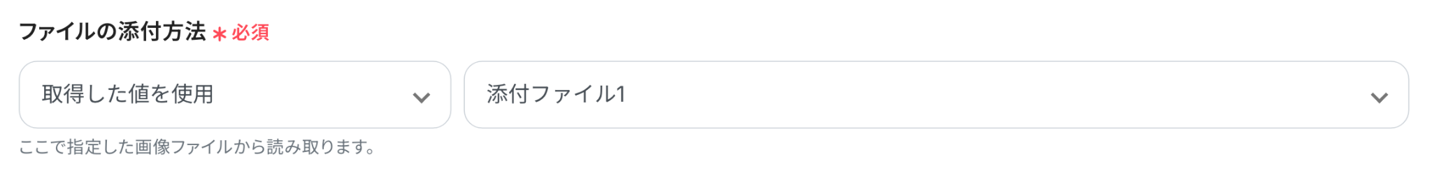 今回は、Gmailのトリガー設定で取得した値を使用するので「取得した値を使用」から「添付ファイル1」を選択しました。