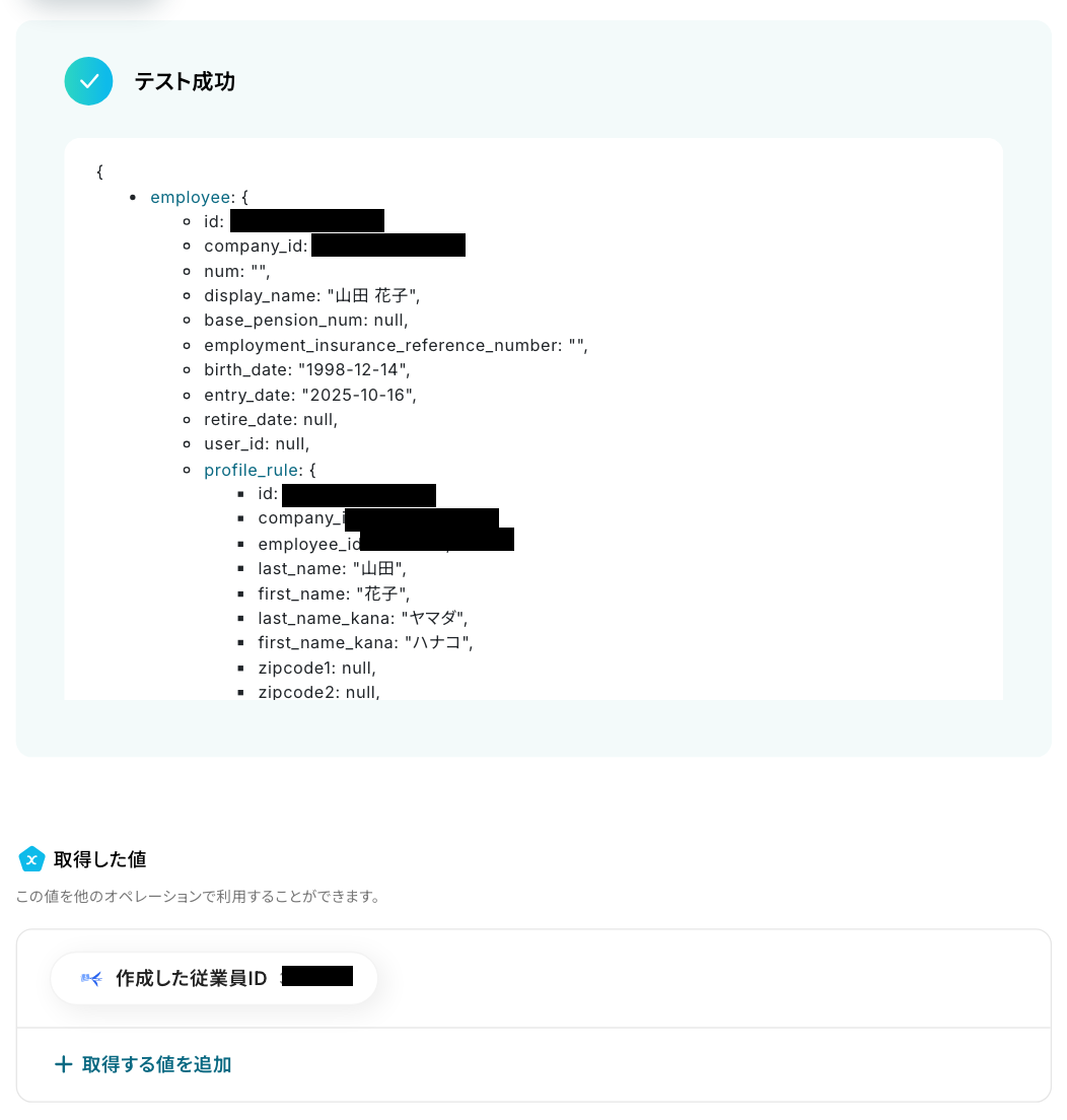 入力が完了したら、「テスト」をクリックしましょう。テストが成功すると、取得した値が表示されます。
