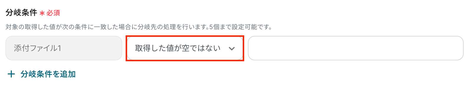 今回はトリガー設定で取得した「添付ファイル1」が「空ではない」場合に分岐するように設定しました。