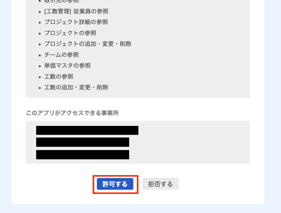 以下の画面が表示されたら、「許可する」をクリックしてください。以上で、freee人事労務のマイアプリ連携が完了しました。
