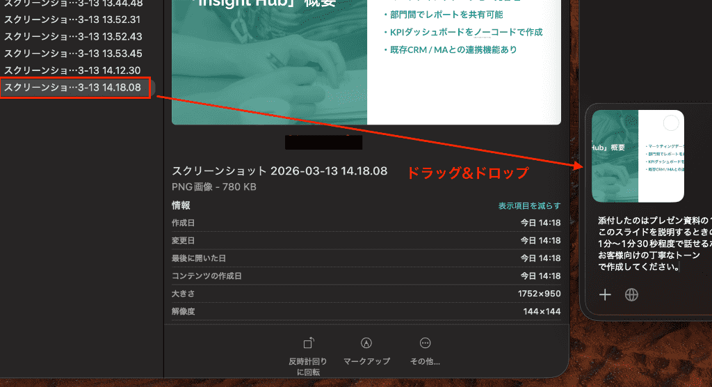 以下は企画提案スライドの一枚を撮影して、そのデータファイルをシュッとチャットにドラッグ&ドロップ。
