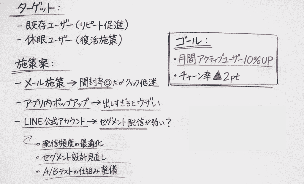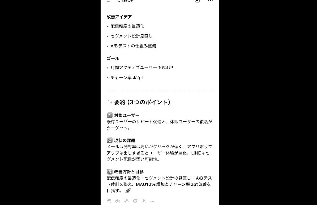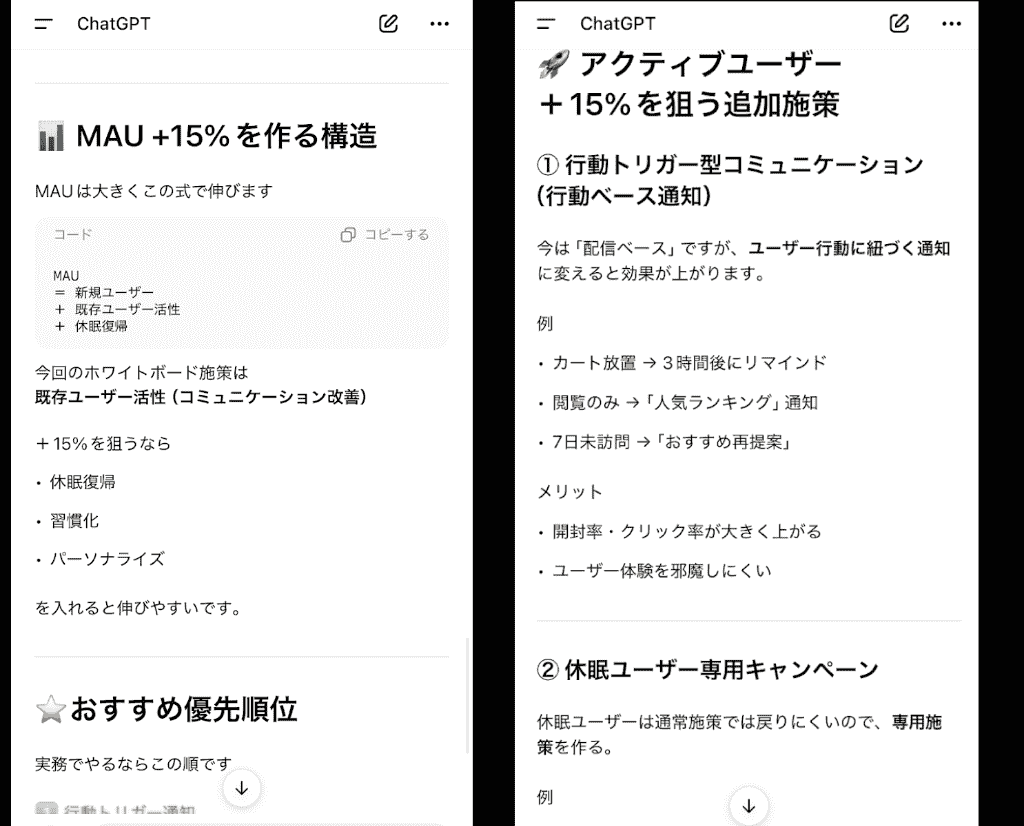 せっかくなので、もう少し踏み込んで「アクティブユーザーを15%アップさせると仮定します。打開策を提案して」と入力してみました。
