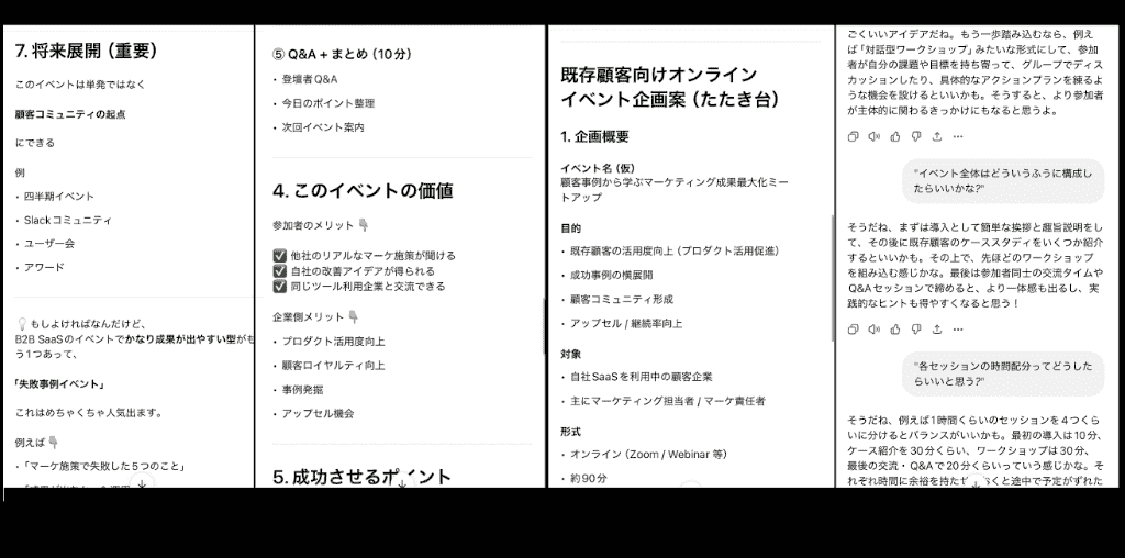 ちょっと時間をおいた後に、テキスト投稿で「イベントの叩き台作って」と指示してみたんですが、こちらの出力も満足のいくものでした!