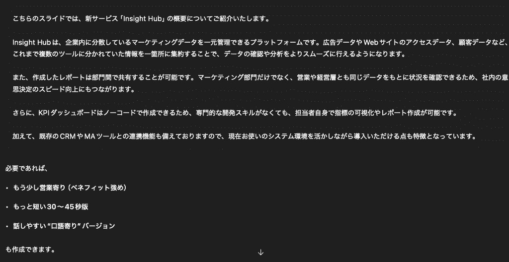 ※この時はプロンプトとして「このスライドを説明するときの「話し言葉の原稿」を1分〜1分30秒程度で話せるボリュームで作成してください。」などと入力しています。