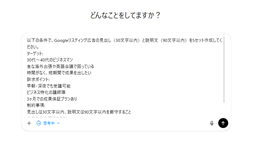 ※「ターゲットの心を動かす必要がある」「高い信頼性が求められる」など、アウトプットの「質」が成果に直結する場面を想定するため、Thinking機能をオンにしています。