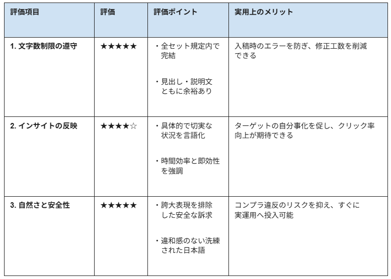 リスク回避の徹底: プロンプトの指示通り、「絶対」や「No.1」といった根拠のない誇大表現が一切排除されており、景表法などのコンプライアンス面でも安全性が高いと言えます。