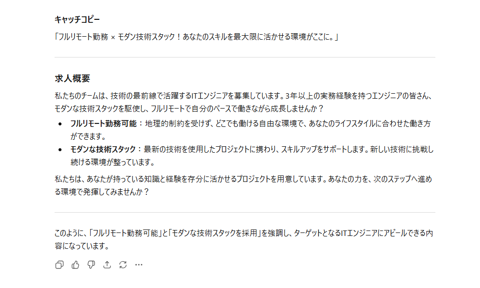 情報の整合性: 指示に含まれていた「フルリモート」「モダン技術」という2つの核となる要素を、キャッチコピーと概要文の両方に適切に配置しています。指示した条件(フルリモート・モダン技術)が正確に反映されており、事実関係の齟齬は発生していません。心理的アプローチ: 「地理的制約を受けず」「次のステップへ進める環境」など、経験者が転職時に重視するメリットを言語化できており、求職者のインサイトを捉えています。構成の論理構造: 結論(キャッチコピー)から始まり、背景、具体的なメリット、結びの言葉という、求人票としての王道な構成が守られており、違和感なく読み進めることができます。