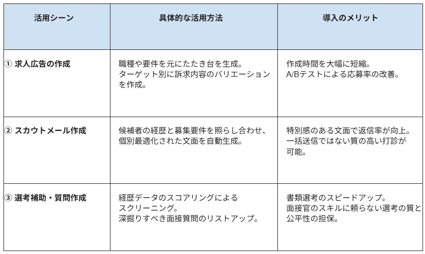 ChatGPTを採用業務に活用するメリットと主な活用方法 採用活動においてChatGPTを導入することは、単なる作業の自動化にとどまらず、採用のミスマッチ防止やより良い候補者体験の提供にもつながります。 ここでは、採用担当者の課題をどのように解決できるのか、具体的なメリットと主な活用方法を3つの視点から解説します。