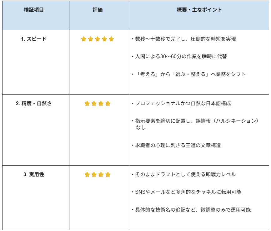 3.実用性 出力された内容は、そのまま求人媒体のドラフトとして十分に機能する「即戦力レベル」であると評価 できます。