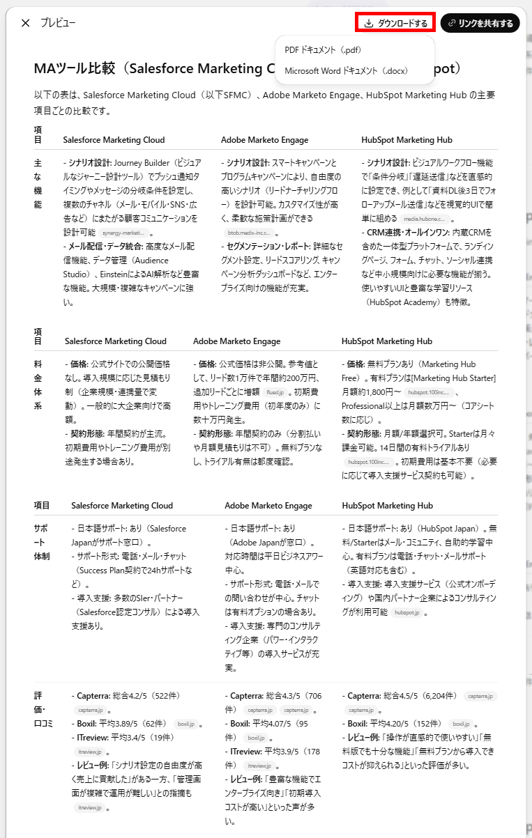 ただしGeminiの場合、文章量が多く、比較表は簡潔にまとめられているだけなので、レポートをもとにした比較検討にはChatGPTが向いています。