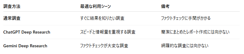 ChatGPTの通常調査とDeep Research機能を比べてみて、以下のことがわかりました。