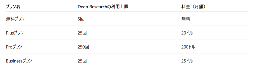 ※Deep Researchには、最新モデルを使った完全バージョンと旧モデルを使った軽量バージョンがあり、それぞれのプランによって利用できる内訳が変わります。(上記は、各バージョンの合算値です)