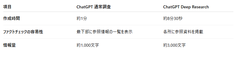 ChatGPTの通常調査とDeep Researchの出力結果は、以下になりました。