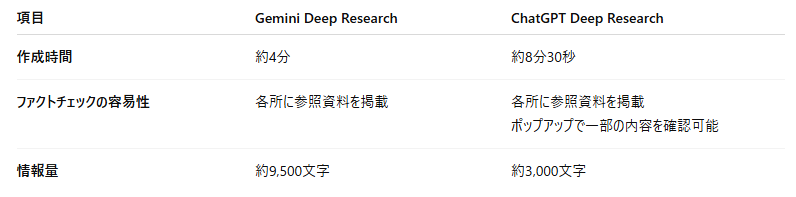 ChatGPTとGeminiのDeep Research機能を比べてみてわかったことが以下になります。