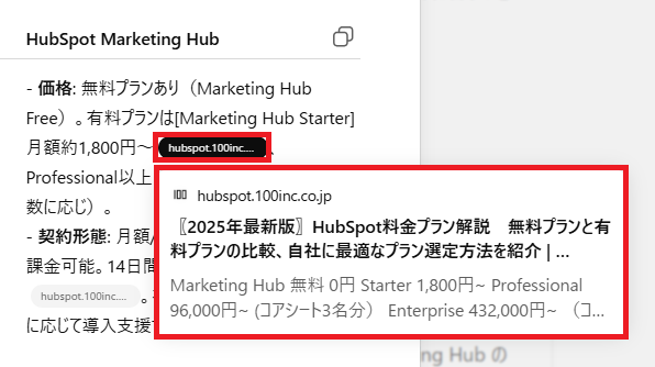ChatGPTの場合、引用した箇所がポップアップで以下のように表示されます。