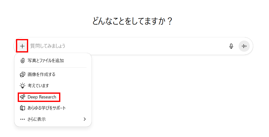 入力欄の「+」マークからDeep Research機能を選択しました。