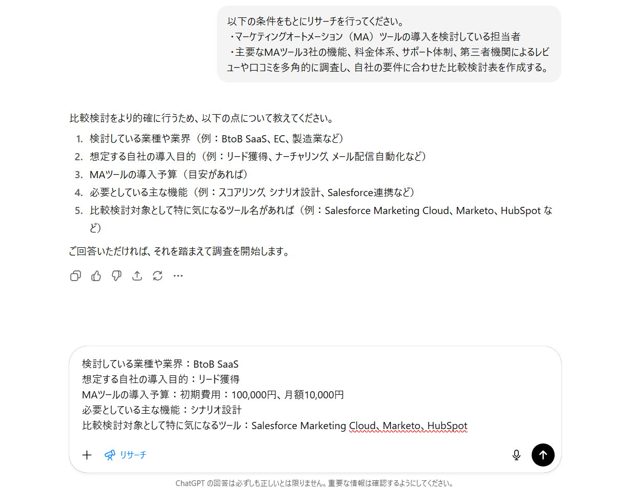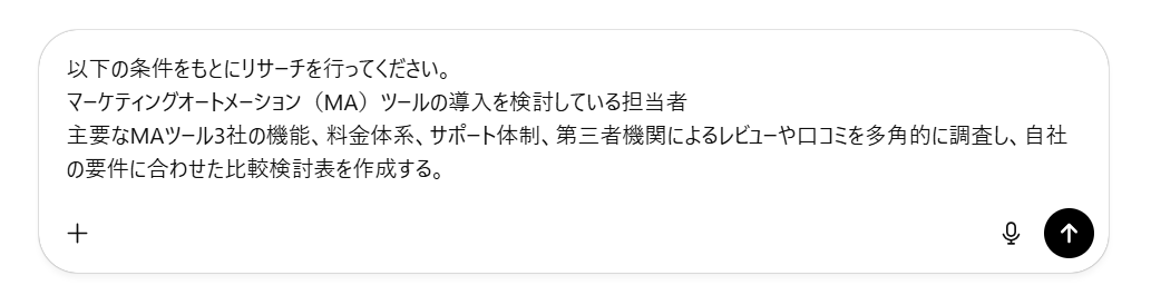 今回は、マーケティングオートメーション(MA)ツールの導入を検討している担当者を想定し、比較検討表の作成を依頼しました。