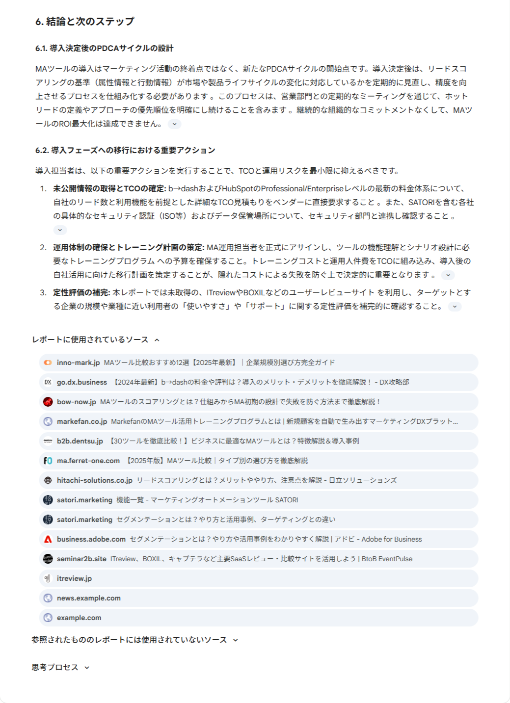また、Deep Researchは単なる情報だけでなく、調査結果に基づき代替案まで示唆してくれたため、まさに人と同じような思考で質の高いレポートを作成してくれることがわかりました。