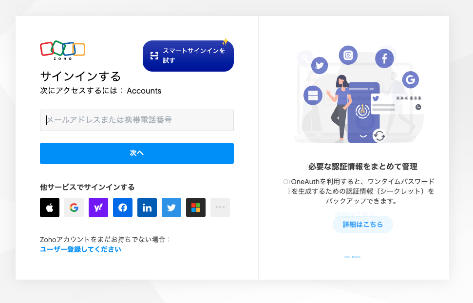 サインインするため、Zoho Mailにご登録いただいている情報(メールアドレスか電話番号)をご入力ください。次へをクリックします。