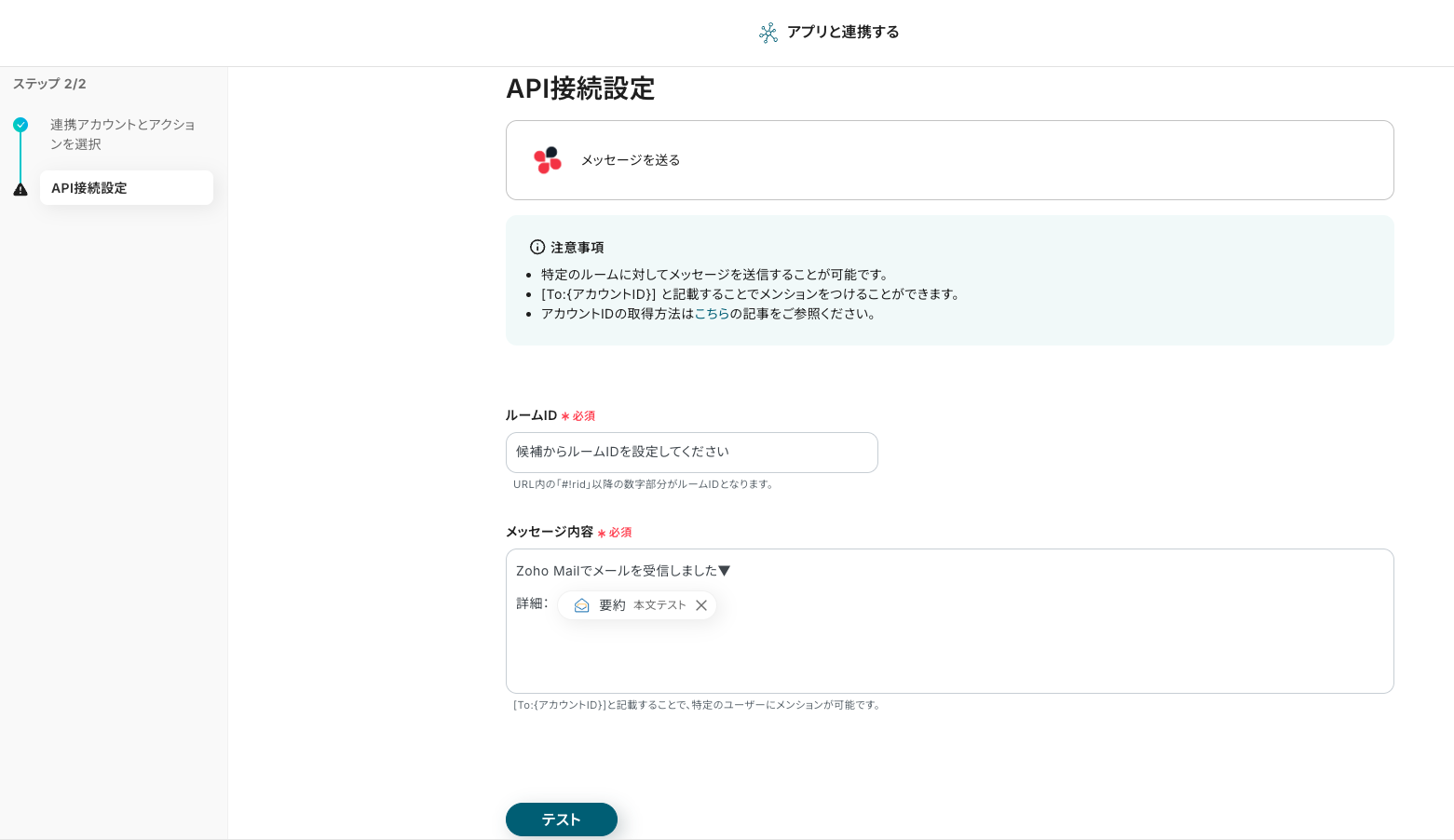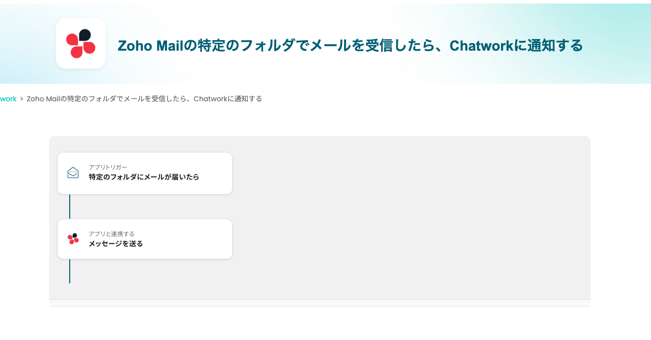 Chatwork APIのメッセージ送信アクションは、他のアプリでの出来事をきっかけにChatworkへ通知を自動化する際に活用でき、例えばZoho Mailで特定のメールを受信した際に、その内容を自動で指定のチャンネルに通知することで、重要な連絡の見逃しを防ぎ、迅速な情報共有を実現します。