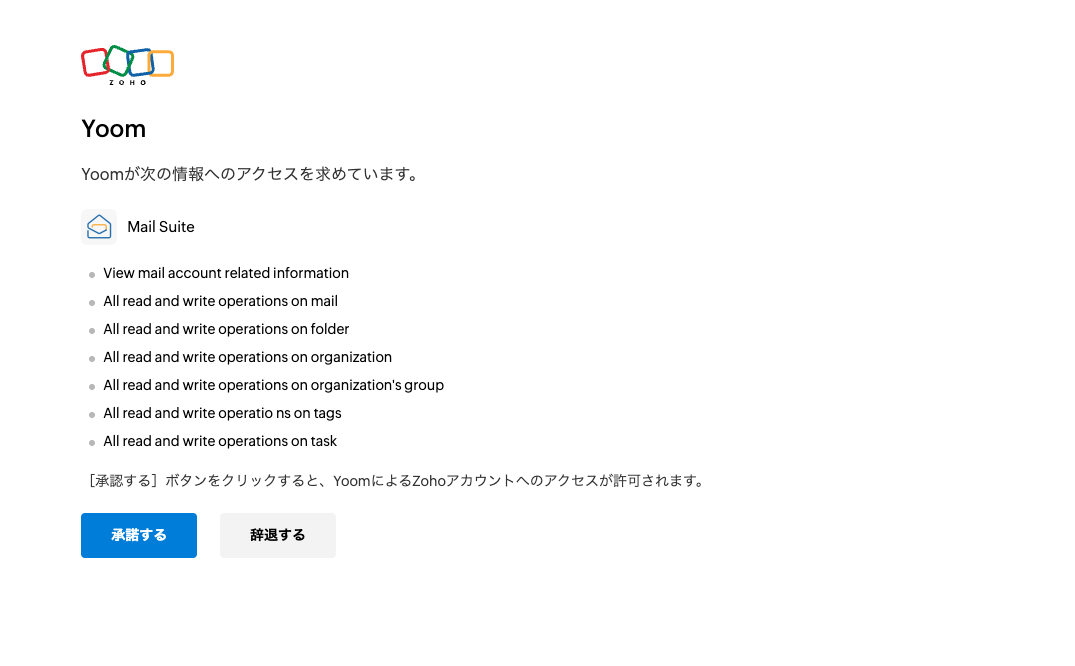 Yoomがアクセスする情報一覧が表示されます。左下の「承認する」をクリックすると、マイアプリ連携の完了です。