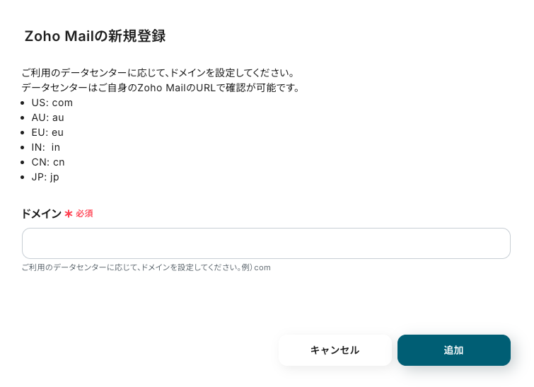 検索結果からZoho Mailを選択します。取得しておいた値を入力する画面が表示されます。
