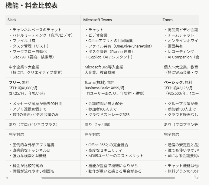 特筆すべきは、料金体系における通貨単位や「1ユーザーあたりの月額・年額」といった細かな条件を漏れなく抽出している点です。人間が複数のタブを開き、各サイトの階層を深く潜って情報を突き合わせる手間が解消されています。
